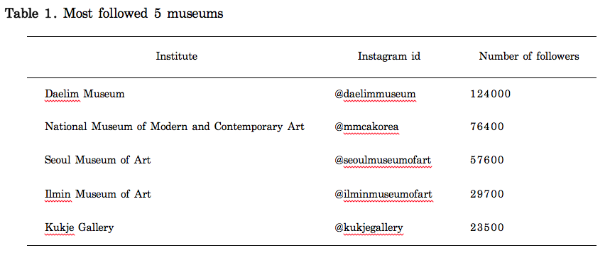 Method and data description Top 5 Korean art museums having most followers on Instagram are selected as shown in Table 1: Daelim Museum; National Museum of Modern and Contemporary Art; Seoul Museum of Art; Ilmin Museum of Art; Kukje Gallery. 1000 users who followed the most recent are collected per each museum. To acquire user data from Instagram, urllib which is a Python package for working with URLs and Selenium WebDriver for automating web application are used. Since a private account is not available to identify user information, samples marked as private are removed from the dataset. To generate user network in terms of the connection between ‘following’ and ‘followed’, the following data, secondary followed account, of users in the dataset are gathered. Hashtags mentioned in user’s posts are also gathered to characterize users. A hashtag is a type of metadata used on social network services to make users find all the posts that have been tagged. Since users put hashtags to explain and indicate the content, the collected hashtags are regarded as a semantic feature. In the process of performing data mining, the combination of symbol characters is deleted from the hashtag list when it slices single word. Emoji characters, on the other hand, are preserved by encoding characters into UTF-8, e.g. 🎨, 📸, 🎬, 😍, 😁, ❤️, 💖, 🌊, ☕️, 🍕, etc.