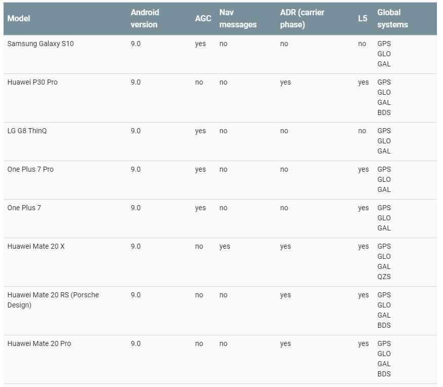 The table below lists devices that support raw GNSS measurements and the data they provide.