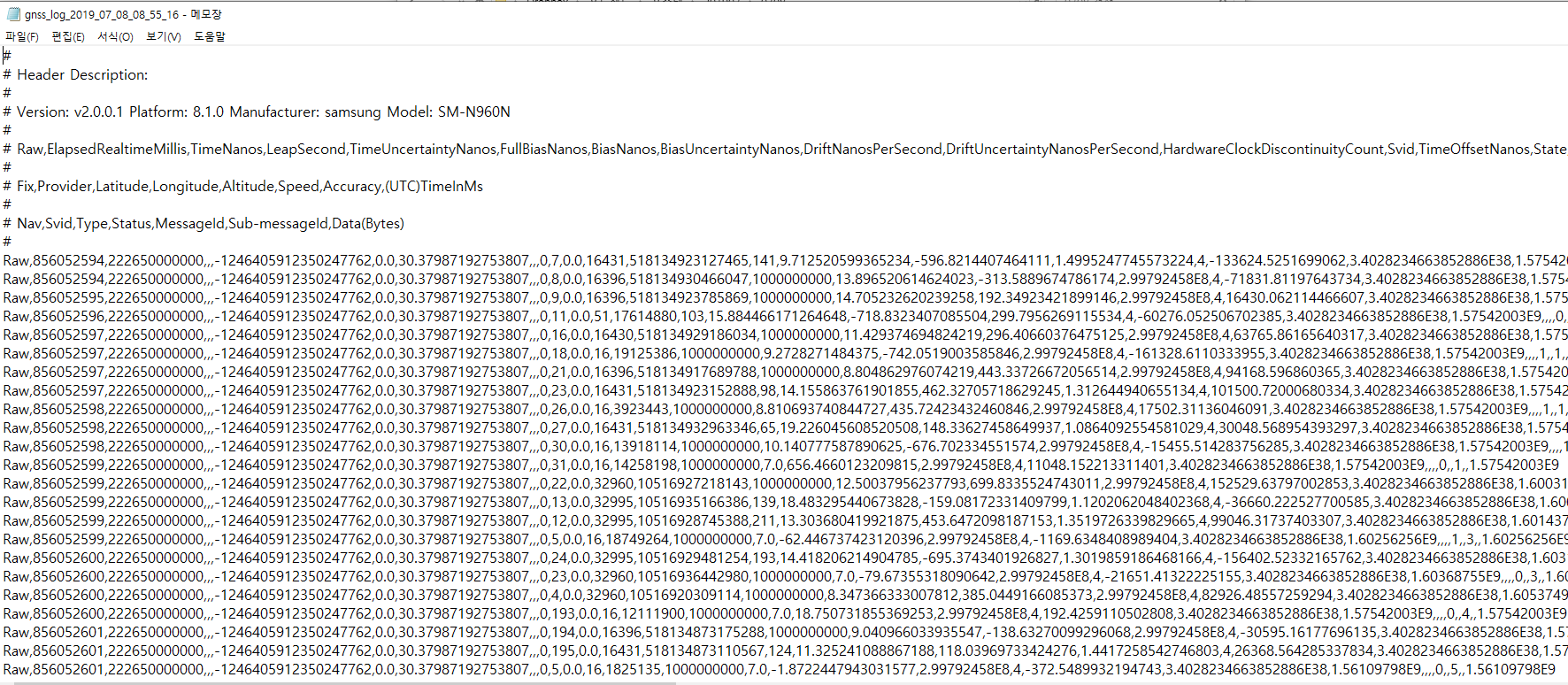 Previously, the Galaxy s7 or Asus smartphone did not collect the GNSS raw data for accurate location analysis. So I checked the spec and tested again with Galaxy Note 9.