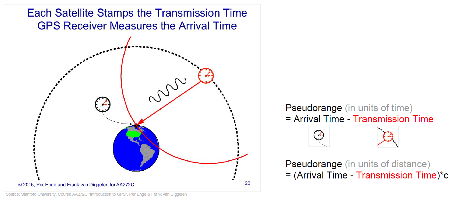 To determine its position, a satellite navigation receiver will determine the ranges to (at least) four satellites as well as their positions at time of transmitting. Knowing the satellites’ orbital parameters, these positions can be calculated for any point in time. The pseudoranges of each satellite are obtained by multiplying the speed of light by the time the signal has taken from the satellite to the receiver. As there are accuracy errors in the time measured, the term pseudo-ranges is used rather than ranges for such distances.
