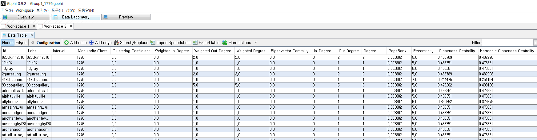 Gephi is a program that analyzes network using noed and edge. I have experience with network analysis before. If you import a map and use latitude and longitude information as a node on it, network analysis is possible through the connection between nodes. In particular, centrality or degree distribution can be analyzed automatically, allowing comparison between groups.