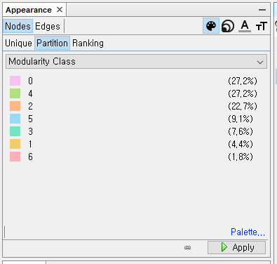 There were 7 communities in airport network. For visualizing network clearly, I need to do the data pre-processing a lot. This open data was intentionally arranged for removing outlier.